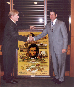 Artist, Thomas Kennedy was welcomed to Springfield, Illinois at a ceremony where he presented Mayor Davlin with a print of his bicentennial painting, "The Life of Abraham Lincoln" .